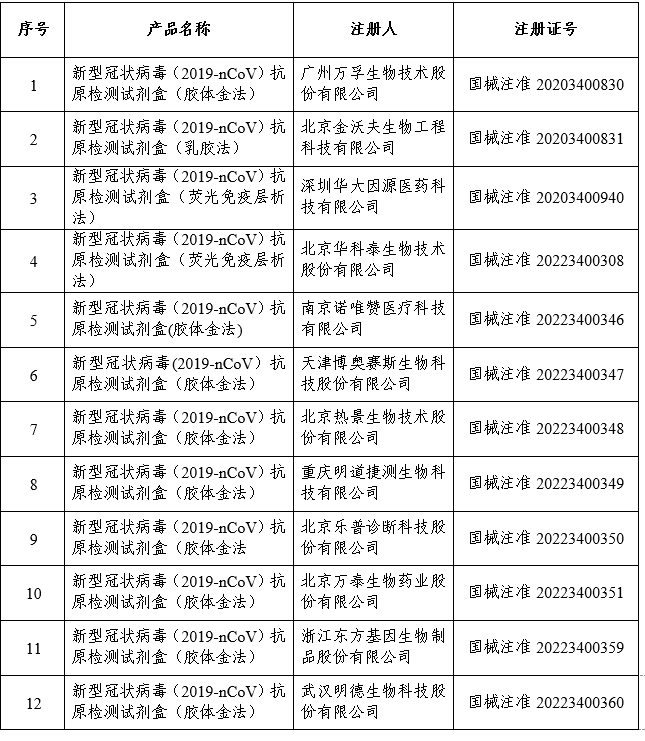 資料顯示,3月12日,國(guó)家藥監(jiān)局發(fā)布通告,批準(zhǔn)南京諾唯贊、北京金沃夫、深圳華大因源、廣州萬(wàn)孚生物、北京華科泰生物的新冠抗原產(chǎn)品自測(cè)應(yīng)用申請(qǐng)變更。3月13日,國(guó)家藥監(jiān)局再批準(zhǔn)5家新冠抗原產(chǎn)品的注冊(cè)申請(qǐng),分別為萬(wàn)泰生物、熱景生物、天津博奧賽斯生物、重慶明道捷測(cè)生物和北京樂(lè)普診斷。